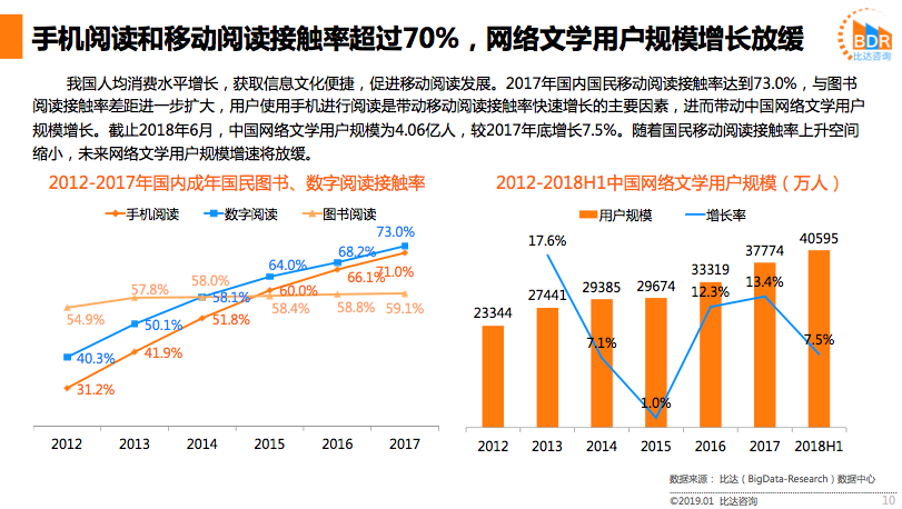 比达咨询发布的《2018年中国移动阅读市场研究报告》显示,2017年中国国民移动阅读接触率达到73%;2018年中国移动阅读市场规模稳步上升,达到 169.3亿元,同比增长20.8%;截至2018年6月,中国网络文学用户规模达到4.06亿人,阅读类软件已经成为移动互联网用户日常重要的应用品类。