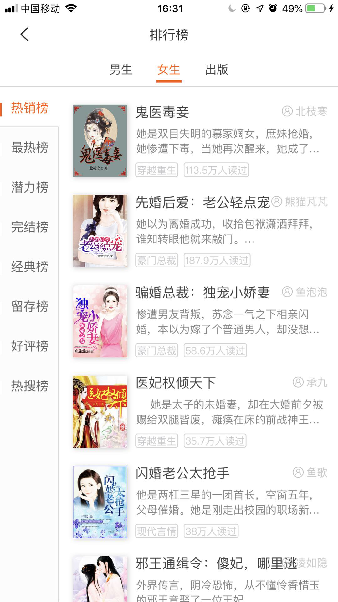 书城频道同传统阅读软件的设计思路类似,也分为“推荐”“精选”“男频”“女频”“出版”等几各二级频道,并且提供分类、排行、最热、完本、活动等不同分类供用户进行选择,这块重点体现出必看小说的“双轮驱动推书理念”之大V驱动,结合了专业人士点评与其他分类推荐。